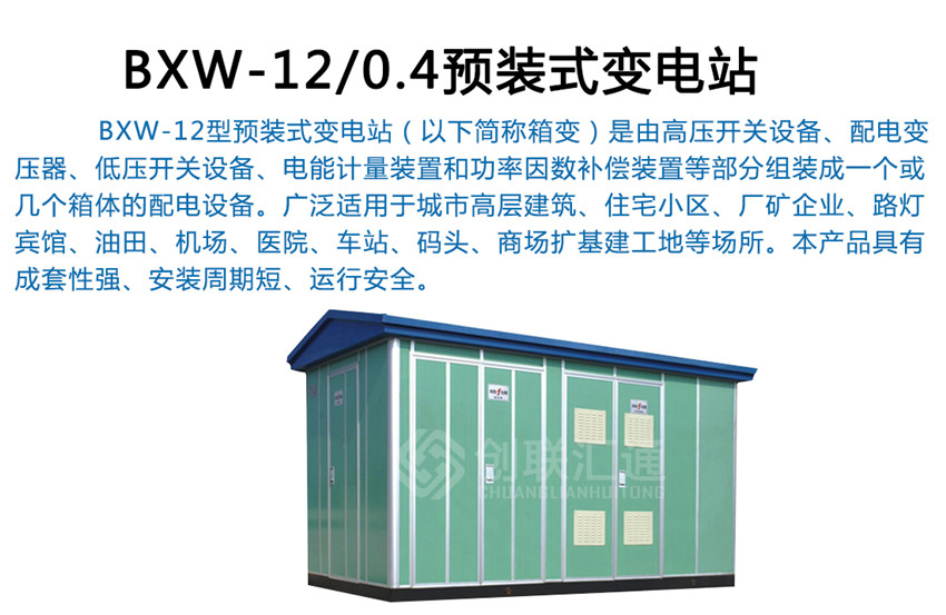 BXW-12型預(yù)裝式變電站(以下簡(jiǎn)稱箱變)是由高壓開(kāi)關(guān)設(shè)備、配電變壓器、低壓開(kāi)關(guān)設(shè)備、電能計(jì)量裝置和功率因數(shù)補(bǔ)償裝置等部分組裝成一個(gè)或幾個(gè)箱體的配電設(shè)備。廣泛適用于城市高層建筑、住宅小區(qū)、廠礦企業(yè)、路燈、賓館、油田、機(jī)場(chǎng)、醫(yī)院、車站、碼頭、商場(chǎng)擴(kuò)基建工地等場(chǎng)所。本產(chǎn)品具有成套性強(qiáng)、安裝周期短、運(yùn)行安全